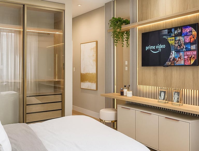 Projetamos dormitórios e closets que são verdadeiros santuários pessoais. Tenha um espaço perfeitamente organizado que não só guarda suas roupas, mas também reflete a sofisticação do seu estilo e garante o conforto que você merece.